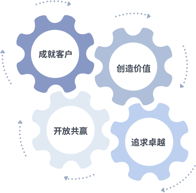 成就客户是一切决策的出发点,,,创造价值是衡量所有工作的标准,,,追求卓越是我们做事做人的态度,,开放共赢是我们的格局也是最终的结果。。。。价值观的齿轮环环相扣,,,,推动着组织里的每个人不断向前。。。。